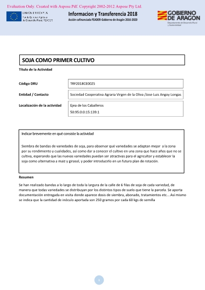 Objetivo: Siembra de bandas de variedades de soja, para observar qué variedades se adaptan mejor a la zona por su rendimiento y cualidades, así como dar a conocer el cultivo en una zona que hace años que no se cultiva, esperando que las nuevas variedades puedan ser atractivas para el agricultor y establecer la soja como alternativa a maiz y girasol, y poder introducirlo en un futuro plan de rotación.