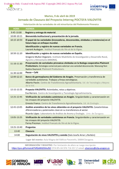 El día 9 de abril se va a celebrar la Jornada de Clausura del Proyecto Interreg POCTEFA VALOVITIS y los días 10 y 11 de abril, se celebrará la 34 Reunión del Grupo de Trabajo de Experimentación en Viticultura y Enología.