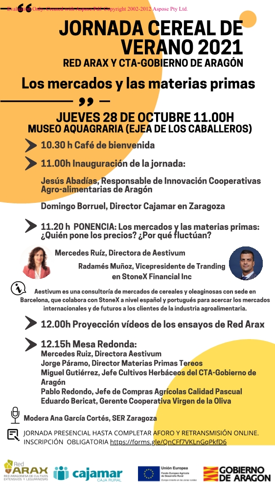 El próximo Jueves 28 de octubre, a las 11 horas en el museo Aquagraria de Ejea de los caballeos, se va a celebrar la jornada Cereal de verano 2021 "Los mercados y las materias primas" organizado por Red ARAX y Centro de Transferencia Agroalimentaria.